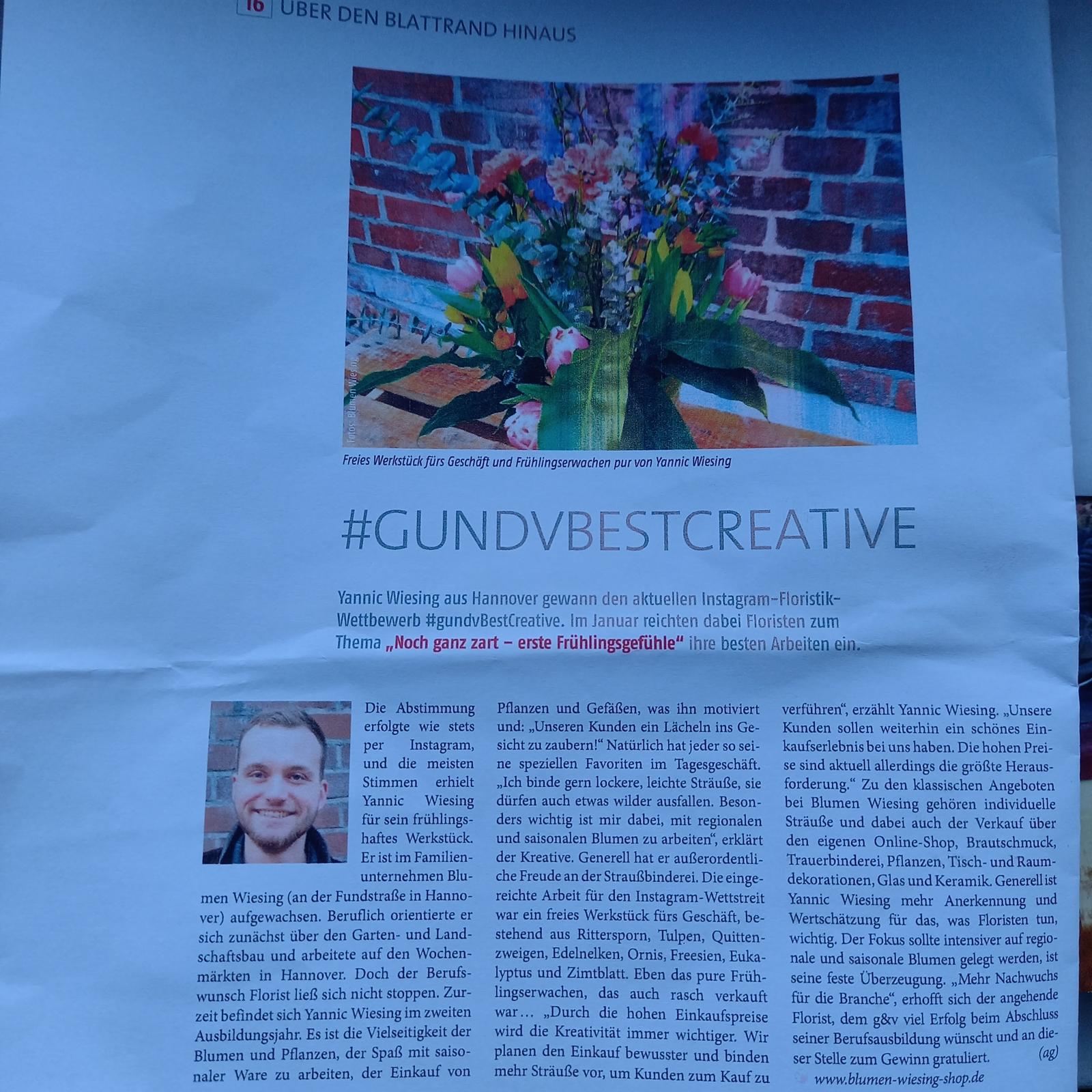 Yannic Wiesing aus Hannover gewann den aktuellen Instagram-Floristik-Wettbewerb #gundvBestCreative. Im Januar reichten dabei Floristen zum Thema „Noch ganz zart – erste Frühlingsgefühle“ ihre besten Arbeiten ein.
